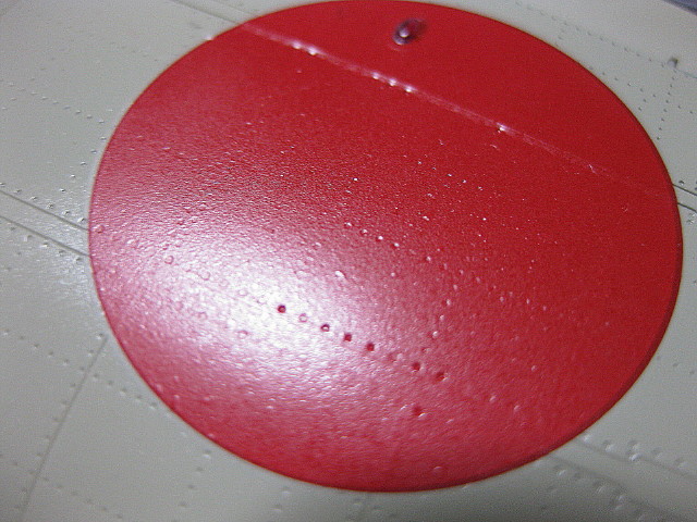 さて新たに部品請求で購入したデカールから、失敗して剥がしてあった主翼下面の日の丸と胴体の白帯を貼ります。