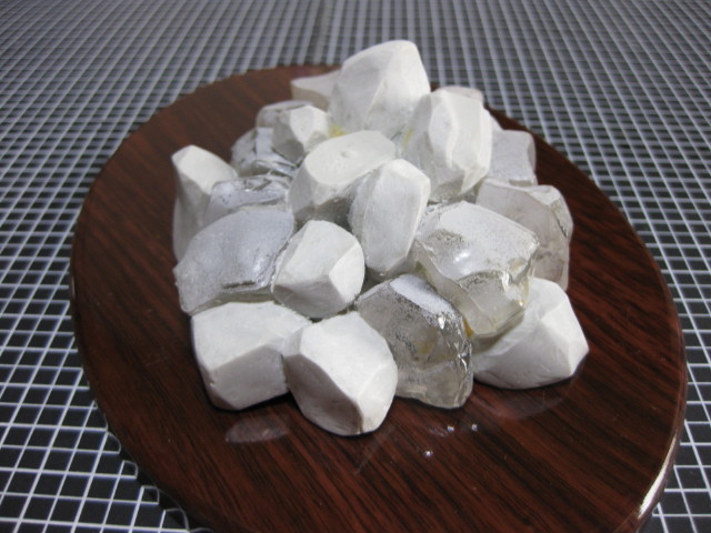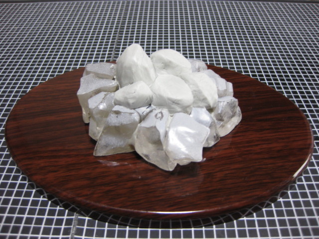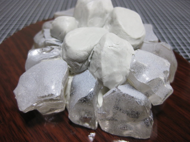 日本庭園がダメならどんなシチュエーション・・?と考えあぐねていたら、いつ何のために買ったのかもわからないアクリブロックなるものが我が家にあるのに気付いたのです。これは透明なアクリルの不定形ブロックでしてちょうど小振りなかちわりの氷みたいに見えるもので、おそらく水槽などの飾りに利用するんではないかと思います。
