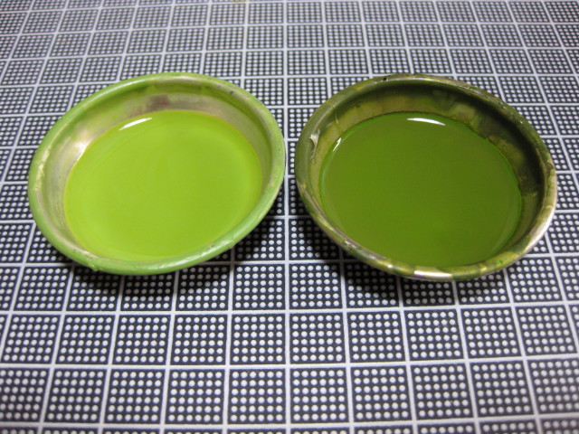 ノーマルの量産型ザクのカラーリングに決めたのでまずはその色を作らねばなりません。ガンダムカラーを使う手もありますがザク用はどこも品切れで入手困難な事と、どのみち色調を変えるつもりなのでここは自作する事にします。