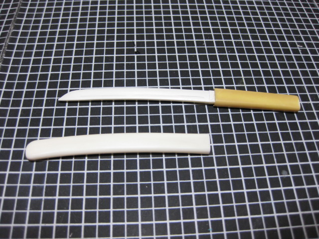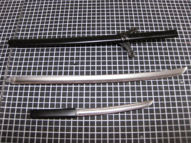 小刀の修正が出来たら大刀と共に塗装します。鞘の色がコスチュームと同じ黒なのでここはツヤを変えて質感の違いを表現すると見栄えがします。