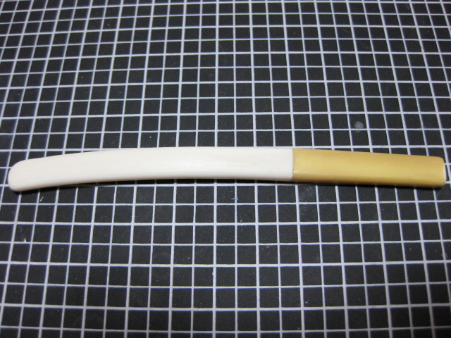 このような鍔の無いあいくちタイプの刀の場合、柄と鞘は同じ太さであり納刀時にはツライチになると思うのですが、このキットでは何故か柄の方が細くなっているのです。
