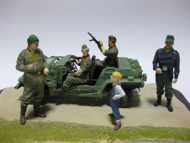 設定としては取説の作例と同じ「作戦前、郊外の農道で待機中」といったものですが、セットに入っている6体のフィギュアのうちサイクロプス隊の4人と現地の少年を使いました。