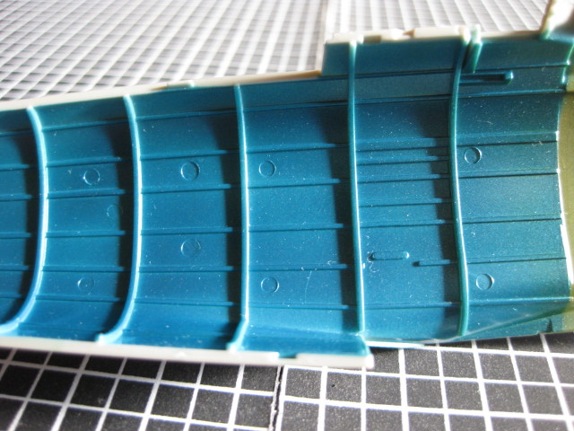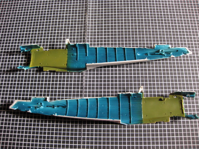 この時も接着部には塗料が付かないことが望ましいので縁の接着部に加えて翼内部のリブにもマスキングするか、または塗装後に剥がしておきましょう。