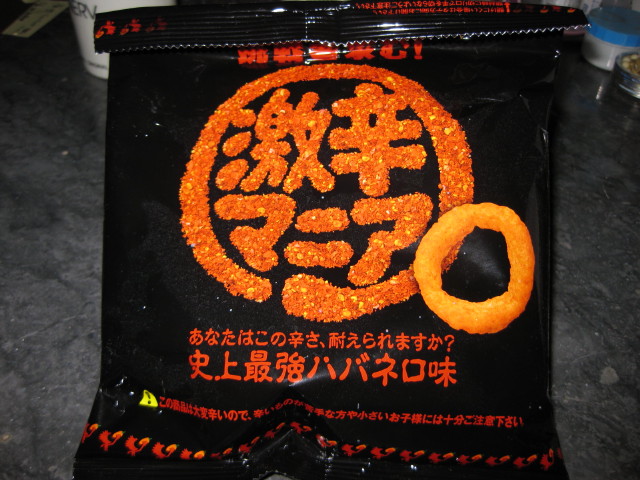 で、辛い物が食べたくなるとグリコカレーLEEやら東ハト暴君ハバネロやらを食してるわけですが、今日帰りに立ち寄ったお店で激しく購買意欲をそそるスナック菓子を発見、当然のように買って帰りました。ネーミングもかなりストレートな『激辛マニア』!ってそのままやん(/TДT)/