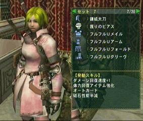 ・フルフルUです。これもピンク色なので可愛いなぁと。はい、まったくもってネタ装備しか作ってないんですよ。スキルは回復に特化してるので、まぐが苦手なモンスター相手に使いたいんですが、苦手なモンスターなんていないので持ち腐れております。ティガレックスとかラージャン戦で使いたいけど居ないしね。