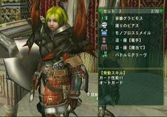 ・フルフル専用装備です。フルフルにはビリビリをガードして槍で付くという戦法がもっとも早くて楽。その為、ガード性能+1を付けてます。これが無いとビリビリでガードした時に後ろへ後ずさりしちゃうもんで。更にオートガードをつける事でガード方向を間違えないという訳です。この装備も雌火竜の紅玉が手に入れば、腕・腰・足の3箇所を「レイアS」にする事で更に防御力が増します。