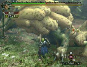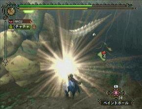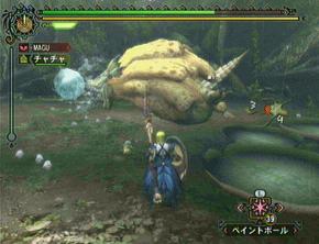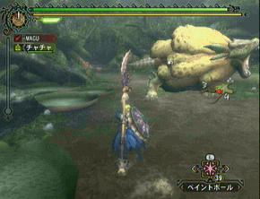 ・「噛み付き」「突進」「ボディプレス」「尻尾振り」などはまぁ普通なのでカットします。基本的には正面ですね。正面に立つとこれらの攻撃が来ます。基本的に正面へ相手が向きなおしたタイミングで回避などをして正面にならない様にする・・・などは当たり前の事ですね。モンハンにおいては基本中の基本です。ま、無理攻めしても食らうのは大した威力じゃないのでダメージ覚悟で攻撃し続けていても倒せるレベルではあります。終盤にはそんな事をしてたら命が幾らあっても足りないぐらいになります。んで、画像は「水吐きブレス」。これを食らうと「水やられ状態」・・・粘液でびちょびちょになるのか、スタミナの回復速度が激減します。時間で治りますけどね。意外と地味に嫌な技。