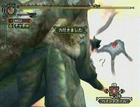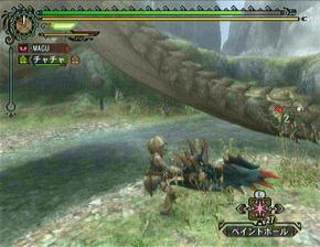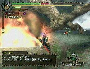 ・今回のシリーズで追加されたのが、ハンターごと捕食するという攻撃が追加されました。空中にいる状態で両足の鉤爪で攻撃をしかけてくる。これを食らってしまうとその後は自動で倒れこみ、リオレイアがのしかかってきた状態で啄ばみ始めるのだ。カプコンお得意の「ヨガクリンチ」「E本田サバ折」と同じ状況で徐々にダメージを食らっていく。そして、これもカプコンお馴染みの「レバガチャ(十字キーとボタン連打)」で直すと。下にあるピンクのゲージが一番左まで行けば開放される。その前に死なない様に。アイテム「こやし玉」を持っていると、レイアの顔面に投げつける事で一発で開放される。レイア・レウス戦では必須アイテムになりそーですね。