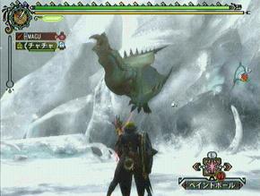 ・別名「氷河竜」。左右の翼にトゲトゲが付いてるので氷の上で迅速に動き回る。MH2Gにも在籍していた迅竜ナルガクルガとそっくりな技を持つ。あのナルガクルガの尻尾叩き付けでも使ってきたら完璧に同じだったのにね。とにかく、終始動き回っているので「怒り状態」になると非常に厄介。「回避」「ガード」どちらも無い場合は壁ハメで簡単に死ねる強敵である。弱点は火属性なんだけど、まぐは麻痺属性を使ってます。うっとおしいので翼をさっさと壊したい。こうすると、トゲトゲがなくなって三角飛びの際に転ぶ様になる。