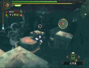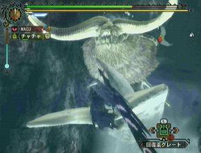 ・さ、今回は村クエストのラスボスです。別名「大海竜」。ナバルデウスという名前。非常にデカイ。ラオシャンロンぐらいはあるんかな。戦闘は終始水中で行われるので、チャチャに「古代のお面」を装備させないといけない。サインを送ると酸素を供給してくれるので、ずーっと水中に居ても戦っていられるのだ。最初は撃退するだけでいいのだが、その終了後にはエンディングが流れる。一応、モガの村を襲っていた地震はこのナバルデウスが引き起こしていたという事。