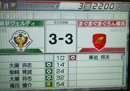 *ちなみにヴェルディで始めると、最低でも8人以上の選手を選びます。資金が6億しか無いので全選手と契約は出来ません。当然、ヴェルディなら「土肥、土屋、服部(ただし左SB)、晃誠、レアンドロ、河野、大黒」らは外せませんよね。・・・ただ、これらの選手を取ると・・・資金残り1億まで減ります。全部で最低でも11人は契約しないとサッカー出来ないので、その後未所属選手を掻き集めてもお金はかかります。さらに年齢が年齢なので考えて契約しましょ。普通は健介、那須川、飯田、河野、藤田、永里、林らを選んだ方が長く活躍してくれますよ。その他の選手は高いっす。オリジナルチームより、Jリーグを選んだ方がやや強い状態でスタートになりそーですけど、お金はひもじくなりそー。