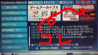 ・んで、話の続き。「Playstation@Network」の項目を下へ行くと・・・「Playstation@Store」というのが出てきます。これを選択しましょう。ちなみに、あなたのPSPがネットを行える環境にあることが前提です。無線LAN、PS3などを持ってる方なら自宅でも行えるはずです。後はネット環境を調べて頑張って下さい。もし、ネット環境が無い場合はお近くの「プレイステーションスポット」