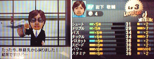 ・だれ? このイカツい人は。実は岩下選手です。今年のフレンドリーマッチで獲得した清水のDFです。アンジェFCというチームに期限付き移籍させておきました。すると、これだけ能力が上がったのです・・・ってよく見ると、レベルが3になってる。つまり、左のステータスに関してはほとんど通常のレベルアップと同じ。違う部分は右の「自信」の部分ですかね。もともと、パワーに評価のある育成先なので「パワー+11」も自信が付きました。更にタックルも「+7」になってるので、2回爆発する事は決まりましたね。ただ、まぐがDFコーチを持っていないのが残念・・・。買わなきゃ。ゲームシステムを理解するのに忙しいや。