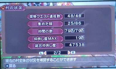 ・全部仲間にしました。さすがに全員と仲良し度マックスにするには時間がかかりそうなので諦めますです。クエストも全部こなしたはずですが、配信クエストがあがっても今後プレイするかどうかは疑問です。レアアイテムも全部は揃いませんでした。