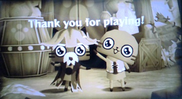 ・んで、これがエンディング画面です。一度クリアした後も宴会(花火)っていうのを選べばまたエンディングが見られます。これは全ネコを仲間にしたらだったか、全クエストをクリアした時だかに見られます。最後はあのモンハン3で出てきた。ラギアクルスとの1戦ですよ。正直、リオレイアの方が断然難しかったけどね。上級クエの場合は最後の方で出るので走って逃げられるので楽ですが、配信クエのリオレイアは真ん中ぐらいで出てきちゃうので伏せてやり過ごさないといけない。それでも、終盤は起きちゃうので結局追いつかれるし。最後は何度サマーソルトで一撃死したことか。面白かったけど続編が出ても買うかどうかは分かりませんね。可愛いので癒されたい方にはオススメだけど飽きちゃうのは早い。