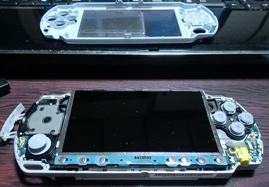 ・あららら、バラバラじゃないの。実はですね。PSPが壊れました。原因は「サカつく」ですね。○ボタンを押しっ放しにすると会話を早送り出来るので、このゲームでは押しっ放しにしてる事が多いのです。そしたら、○ボタンを離してるのに押しっ放し状態になってしまい、ゲーム操作が出来なくなりました。電源を切っても、電池を外してもダメ。となると、この手の故障は埃が詰まってるだけなので分解したのです。だって、修理に出すと1万円とか言うんだもの。