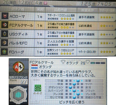 ・オランダチ-ムならどこでもいいって訳じゃないけど、出来れば強いチームが良かった。そこでオランダ2位だったFCアルクマールの監督へ就任する事にします。ちなみに移籍する際に全然オランダチーム出てこなくて何度かリセットしました。本物はAZですよねー。さぁ、こっから先は長いけど未所有カップとエンディング見たら次のチームへ移籍しまっす!!