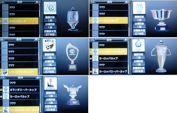 ・左上からオランダリーグ、ヨーロッパカップ、オランダカップ、オランダスーパーカップ、ヨーロッパスーパーカップとなっております。1つの国でリーグ、カップ、スーパーカップと3つのタイトルが獲れるみたいですね。こりゃ、全タイトル獲らないといけませんね。