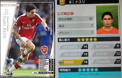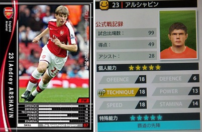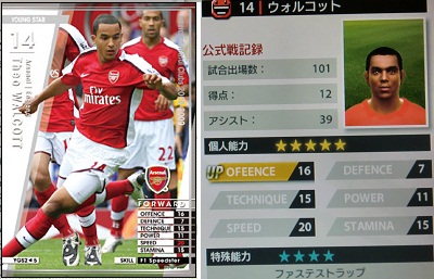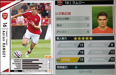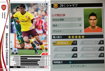 ・主にウォルコットの控えとして起用。サイドを縦に突破する技術は欠けてますが、時折魅せる斜めに流すスルーパスが見事。アーリークロスなんだけどグラウンダーがアーセナルっぽくて素敵でした。ただ、ドリブルでDFを一人もかわせない事が多いので、ウォルコットの控えにするにはやや力不足。実際はもうちょい真ん中よりで起用する選手なんだろうか。裏のカード面には右サイドしか色が変わってないんですよね。