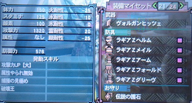 ・ラギアクルス装備です。「属性やられ無効」が付いております。これで憎きジンオウガ亜種にも対抗出来る・・・・って龍属性がマイナスやん。そこまで調べておかなかったよ。なので、ジンオウガ亜種の玉が大ダメージ、3分の1は持ってかれる。でも、ウチケシの実が入らない分我慢して使ってたんです。そしたら、まぐがどんどん上達してジンオウガの攻撃が当たらなくなってきちゃいました。なので、現在はセレネZの匠装備+抜刀会心の方が早く倒せるので(それでも30分)、ラギアZは作っておいてお蔵入りになっちゃいました。時間を損した。