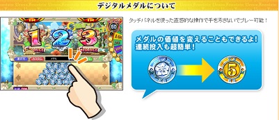・それと今回のゲームで面白いのが「メダルのデジタル化」。メダルを投入するとクレジットとして溜まる。メダルを投じたい時に画面上のボタンを押すと出るという仕組み。そして、下に落ちたメダルもデジタル化されます。さらにはスロットが当たると盤面に降り注いだメダルも、一部直接クレジットになるものもあるそうです。何度も入れたり出したりで手が汚れるのを防ぐ良いアイデアですね。