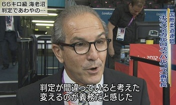 ・それが準々決勝での韓国選手「チョ・ジュンホ」との試合で、日本の海老沼が優勢で試合を進めて旗判定へ。旗3本で韓国選手が勝利・・・解説の方も「えーーーーーーっ!!!!」って叫んでるし。会場は大ブーイング、野次が飛び交い騒然となる。しかし、ここでジュリーと呼ばれるビデオ判定を担当している審判委員達が判定を覆す様にと指示したという。これで一転して白3本の判定で海老沼が勝利した。まぁ、そもそも小内狩りの時点で決着のはずが取り消された判定をしたのもジュリーなんだけどね。まぁ、過去の柔道でも不可解な決着は多かったので、サッカーでは嫌だけどビデオ判定仕方無いのかもねー。スローにしないと背中付いたかは見えないっしょ。