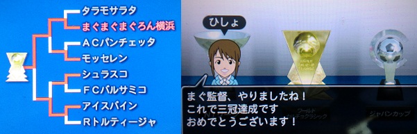 ・はい、途中までいい感じだったので、メンバーを下げるという発想で試合しました。気付いたら追いつかれてるし。いやー、最後は何か危ない感じでの優勝でしたよ。それにしても、毎回同じ様なチームしか上に来ないね。上位陣の戦力を奪えば落ちるらしいんだけど、サカつくはこっちであげられるしね。ジードを鹿島にあげたらえらい強くなっちゃったし。