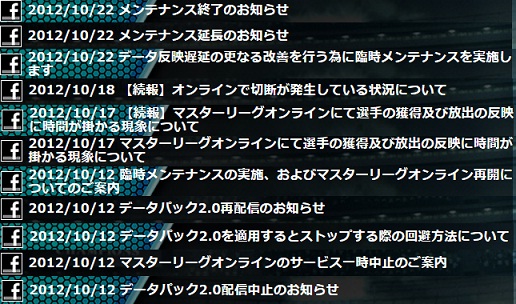 ・発売初週で120試合もこなしたのに、2周目で「70試合」しか遊んでおりません。それは何故か・・・実はKONAMIさんがだいぶやっちゃったのです。2週目において、謎のメンテナンス続発。12-13シーズンの移籍情報のパッチ処理で不具合発生。まぐは回避しましたが、謎のフリーズが起こったそうです。その後も謎のチケット代遅延、謎の回線切断など問題が後から後からやってくる事態。トドメはまぐが休みの月曜日に朝の10時から12時まで臨時メンテナンス、更に延長で15時まで、しまいには「終わり次第」になるし。結局、月曜はやれませんでしたよ。・・・まぐが満足なメンバーを集められるのはいつの日か。