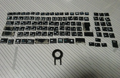 ・こちらが全部のキーボードです。全部外してやりました。あ、ちなみに全部無理矢理引き抜いたわけじゃないです。外し方があります。下に映ってるのがそのキーボードを外すやつです。これでてこの原理を利用します。1つのキーに4ヶ所止め具が付いてるので、右に傾けると「カチカチ」と2回音がします。今度は左に傾けるとまた「カチカチ」と2回音がします。これで外れるはずです。この原理を利用すれば、マイナスドライバーでも充分取れますよ。