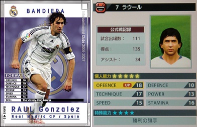 ・カードの性能的には中山に近かったかな。ドリブルに関しては抜けないと思ったほうがいいので、PAぎりぎりならミドルシュートを撃った方が入ります。サイドからのクロスをヘッドしたら外しません。ロングボールを受ける事も得意です。ただ、早めにシュートボタンを押すとスライディングシュートを頻繁に狙うのですが、これが意外とスーパーセーブされます。なので、足元の場合は気をつけて。もっとも多かった形が足元でトラップして、反転してふわっと浮かせたパスをラウールへ通すのが得点パターンでした。当然ですが、相方は裏へ飛び出す系でお願いします。長身FW系の白カードにしては、優秀なカードと言えると思います。スタミナも持ちますよ。