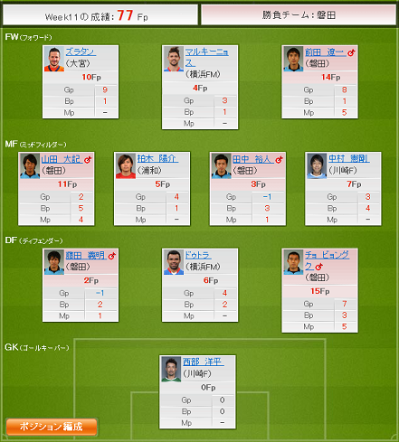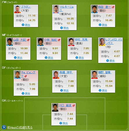 ・J2は結局あんまり変えない陣容でのぞみます。神戸のエステバンはなかなか良い選手なんですが、ファンタジー向きじゃないんでしょーか。ヴェルディ戦でたまたま活躍しただけかもしれない選手もついつい選んでしまいますね。