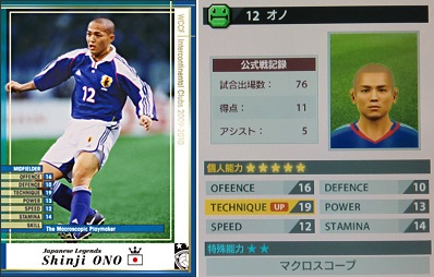 ・白カードのよりはいいってレベルでしょうか。攻撃で気になったのはゴール前でもパスありきでドリブルするところでしょうか。GKと一対一でもパスしちゃいます。裏への飛び出しはほとんどなく、基本的には足元で受けて足元へ出す感じ。スルーパスの類は無く、ヒデと壁パスすることは多かったです。小野が壁ね。ミドルは狙いましたがボテボテ。エンジェルパス(WCCFではベルベットパス)と言われた柔らかいパスはあんまり見られませんでした。右SMFと言う事でサイドでの起用が失敗だったんかも。縦へのドリブル突破も加地より勝てず。課題だらけですが、もっとも厳しいのがスタミナ。90分最後まで持ちませんです。あと、残り10分ぐらい足りないぐらい。練習休んでれば90分大丈夫ってレベル。交代要員は考えていた方がいいかも。