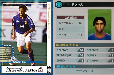 ・ブラジル人だったので足元で欲しがるんですよ。サイドの裏へ走って欲しいんだけどねー。サイドでの一対一も勝てるっちゃ勝てるけど、優良白程度にも止められるレベルかな。ドリブルはトリッキーというより真っ直ぐドリブル。スラにはよく止められる。クロスの精度も頭に合わせるよりはグラウンダーが多い。ニアのDFにはよく引っかかる。PA内での決定力は日本代表にしては高い方なのでセカンドトップでの起用も可能。欠点は小野よりは持つけどスタミナが問題でした。前半でアレックスばっか使うと後半やばい時も。特殊実況が「超攻撃的ラテラウ(SBの意)」なので、本来の配置位置は左サイドバックなのかもしれない。次回は左SBで起用します。