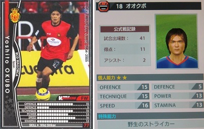 ・何気にゴンよりも柳沢よりも独力突破は出来るタイプでした。柳沢が理性で大久保が野生ってのも変なネーミングだけど、前線でのスピードはなかなかでしたよ。ただ、中盤でのスピードは全然無いのでPA近くで急にアクセルを踏む感じ。スピード16の割にはシュートタイミングを逸してしまうほどにグッと入り込むので注意が必要。ボールタッチも大きくなりがちなのでGKにキャッチされない様に。大久保もスタミナがアレなので後半要員でした。日本人選手は総じてスタミナがやばいっすねー。