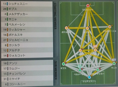 ・レア戦術「チャイドルキング」をボランチで起用したらどうなるのか。いやー、あんま目立たなかった。トップ下で輝かせた方がいいです。DFラインは全員ウィルシャーを経由するので、守から攻への転換はスムーズに行きます。「奪って奪われて」のピンチは無くなります。相手と重なってもウィルシャーの擦り抜けの方が上回るので。ただ、ポジションがかなり低いのでそこからのパス交換ではアシストは付きませんよ。「奪われて奪い返して」の一番槍にはなれるんですが、ウィルシャーはトップ下でそれをやってこそ結果が出るタイプの様です。まぁ、そのままボランチで守備だけに専念させても、これからはエジルがいるんですけど。
