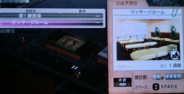 ・んで、最初は「マッサージルーム」ですね。前回のブログを読み返してみると、「全治42週」という重傷者が2名出てます。今回はどうか分かりませんが、序盤のスタミナ不足によるケガは多いです。なので、休養が大事になります。その休養に効果があるであろう施設が「マッサージルーム」しかないので最初に建てときますです。これはみなさんにもオススメしておきます。