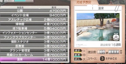 ・今回は欲しい選手が桜井しか居なかった事もあって、施設建設に重点を置きました。それも、収入系の「シネコン」「温泉」を設置。値段にしてシネコンが8億円(7億5200万円)。温泉が15億円(14億1000万円)でした。まぐは割引系があるので()内は割引金額です。1試合あたりの収入がシネコンで1億5千万円。温泉で更に増えて、1億8千万円と増えました。ただ、スペースが無いので「イベント会場」「公園」「売店」を破壊しました。まぁ、仕方ないやね。