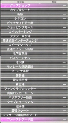 ・「グッズショップ」「ファンクラブカウンター」「ロッカルーム」は普通に建てて終わりです。メガスタなら全部同時作業でもスペース余るんで出来ると思います。ただ、1つ問題なのは、これだとスペースが余るんですよね。それなのに、「施設数の上限を越えてます」とか言われて設置出来ない。「イベント会場」なども建てたいんだけどねー。なので、スタジアム検証の続きとして、海外移籍したら「芝生席」「電光掲示板」を作らないってのもやりたいですね。選手像とかもいらないかもねー。