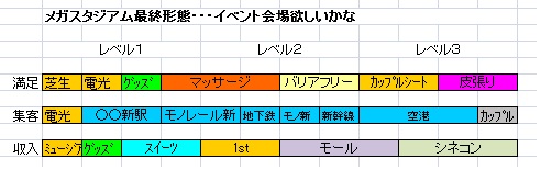 ・これがまぐが決めるメガスタジアム施設の最終バージョンです。どうです? みなさんと同じでしょうか。コンセプトは「満足」「集客」「収入」バーは満タンにしたかったこと。もひとつは出来る限りプロモーションの増える施設が欲しかった事。最後は有効度に関係有りそうな「高級ロッカールーム」、クラブ人気に関係有りそうな「ファンクラブカウンター」で終わりです。下にこれらの作り方を書いておきますねー。ややこしかったら、全部壊して最初からやり直してもいいですよー。