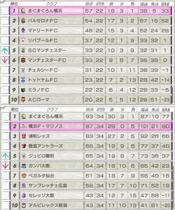 ・WPSの順位は当然の1位ですが、バルサが意外と肉薄してたんですね。サテライトリーグ(J)の方は再びマリノスが2位浮上。それでも、なかなか3位より下に落ちないレッズ。今度はジェコじゃなくて、エドリエーナなんて選手獲ってやがるし。新たなる怪物ー♪ あどりあーのっ!だったりするかもね。