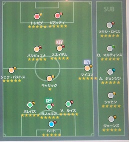 ・本物もWCCFでも成績は芳しくなかったですね。対人戦での圧倒的な不利が祟りました。まず、攻め手が森(マイコン)しか無いってぐらい何も出来なかった。西(スネイデル)のパスにも期待したのですが、高原(トレゼゲ)とのコンビは冴えず、常盤(マルティンス)の独力突破も影を潜めました。守備は1ボランチ3バックだったので、両サイドに張られてしまうと5バックにしないと対応が出来なかった。故に完闇じゃないと優勝は難しかったですねー。まぁ、その完闇ICCですら逃しちゃうんだもん。