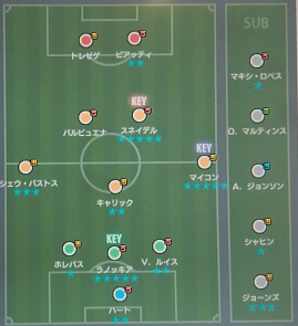 ・マルティンスはこれで2度目の起用なんですが、前よりも使い勝手が悪くなってる気がしますね。今作のWCCFではフィジカル上位者との競り合いの際に、身体を強引に前へ入れる「手を伸ばす」動作があります。これで大体のボールは奪われてましたね。イーブンボールでも速さで抜き去ってしまう能力があったのですが、後ろからでも引っ張られるので速さも関係無いですね。何気にシュートテクニックも酷いもんで、右足だとほぼ決まらない。左足でも確実に決まるって訳じゃないのでかなり辛い。前はこんなに決定力の無い選手だったかなー。前は優良白カードって気がしてたのに、今じゃFWでの起用は難しそうですよ。更に控えだった翔哉(ピアッティ)が大活躍しちゃったから、最終的にはこっちが控えになってました。