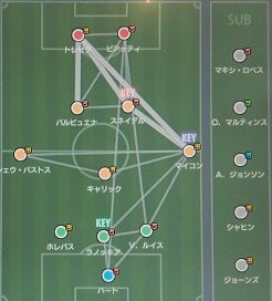 ・レア戦術「ダイレクトアクセル」を発動させたんだけど、これのおかげで西(スネイデル)らしさは失われましたね。ダイレクトでパス交換をしやすくなるんだけど、大抵は西を経由するのでCBのハイボールなども多くなってしまった印象。ハイボールをスネイデルが落とすのは難しいよ。なので、中盤にヴィエラ、ヤヤ・トゥーレなどの屈強なボランチが居ると手も足も出なかった。パス回しに関しても、森に対してのラス前パスばかりになってしまった。それでも、40アシストしてるのは何気ない縦パスを高原(トレゼゲ)が強引に決めてくれた効果も大きい。うーん、確かに対人戦でスネイデルの起用をあまり見ないんだけど、トップ下としてWCCFでは必須項目である「前線からの守備」が無いからでしょーか。FWが奪われても、トップ下が奪い返してゴールってやつ。ヒデは持ってるけど、エジルやスネイデルは持ってないんだよねー。