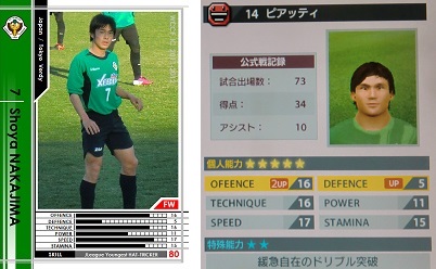 ・キャリア最高のコンディションを魅せた飯尾でしたが、WCCFでは使い方がイマイチだった様で。個人的にはFWを追い越さんとばかりにPA内に飛び込んだり、FWへ直接の縦パスをぼんぼん入れてくれたり、中にはドリブル突破で自らがゴールというのを想定してましたが、意外とぽつんと佇んでるシーンが多かったです。ドリブル突破もテクニックというより、スピードで抜きたい選手の様でサイドで使う方が良かったみたいです。先ほども言いました通り、トップ下としてWCCFでは必須項目である「前線からの守備」が無いからですかねー。