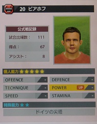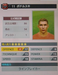 ・ハーフタイムや後半からポドルスキーを入れてるので、ゴール数が折半される印象。試合時間はビアホフより少ないのにこのゴール数は多い方。とにかく、GKと一対一で左足なら外す事は無い。意外と左に拘らないので、右の時は右で蹴る。こちらでも遜色は無いがCKになりがち。ボールをもらってから無駄な事はせずに真っ直ぐゴール前へ突進するので使い勝手は良い方。シュートのタイミングもPAギリギリで充分にシュートレンジ。外からでも決まる。このバージョンのポドルスキはゴールだけを狙うタイプのFWに仕上がってるので、ポストとしてはあまり向かないかも。パス出しに関してもあまりせずに強引に縦へ行っちゃう傾向。さぁ次回はいよいよアーセナルユニだっ!