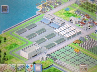 ・更にシムシティには無い概念が「資材」ですね。画面に映ってる工場が「資材工場」、白い箱が乗っかってるのが「資材」ですね。街を発展させるには工事しなければいけない、工事に必要なのは建築資材。それがこの「資材」ですね。なので、街のあちこちに「資材置き場」を置いておけば街は勝手に発展する事になる。この概念を覚えないといけないんですね、「A列車で行こう」の基本みたいです。なので、電車(貨物)やトラックで街の隅々にまで行き渡せる事が序盤の攻略の様です。