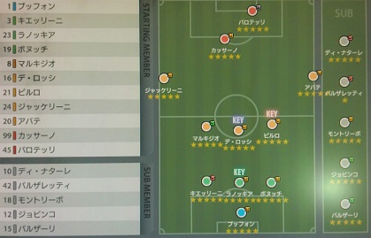 ・レア戦術「軌道の軸」の恩恵は試合をするだけで感じられます。とにかく、逆サイドへのロングフィードが凄まじいです。ただ、実際は右サイドにパスをして欲しい時に矢印を「→」にのみ点灯してると、左サイドへロングアーチを描くシーンが出来ちゃうので言う事は聞きません。元の戦術は「逆サイドアタック」なので。ちなみにこの戦術はチーム全体に浸透しますので、中盤のマルキージオ、デ・ロッシからでもロングアーチが飛び出ます。いずれもロングパスの精度は高かったので面白かったですよ。守備に関しては、オリジナルポジションは守りますが、そこを飛び出してまで奪いに行く事は無い。デ・ロッシの守備範囲の広さに助けられた感はあります。ロングフィードもダイレクトで出す訳じゃないので、トラップ後に奪われる事は多々ありました。対人戦ではそれが顕著でメッシやロナウドに奪われてました。直接FKの機会も少なかったので、あんまりFKは観ませんでした。イタリア縛りでやりたいなら、中盤にピルロ、デ・ロッシはかかせませんね。
