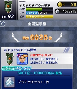 ・初めて全国選手権をやったのですが、基本的に試合は観てるだけ。シュート、プレスは出来ない仕様。矢印で戦術をいじれるだけ。それでも、なかなか勝てるもんで地域予選を突破し、全国まで出場出来ましたよ。最終結果はご覧の通り。決勝には100位以内だそうで。まぐはここまででした。賞品もしょぼいもんだ。以下はもうすでに終わった☆4勢ぞろいのフレガチャの残りです。実はこの際にまだ1万ポイントも残ってたんですよ。0になるまでやればよかった・・・。