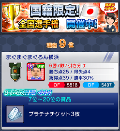 ・いやー、参りました。日本人大会は地域予選3回戦で終了。3位以内どころか9位でしたよ。まぁ、敗因は「覚醒」せずの選手が多くなってしまった事。DF柱谷、井原、MFラモス、FW岡崎の4名は覚醒しておりません。更に報酬で貰った☆5北山を一切育成させていないので、2ボランチにも出来た事。いやー、色々と悔いが残りましたけど仕方無い。