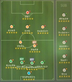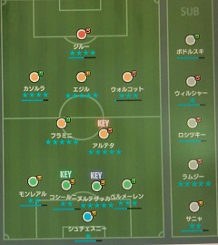 ・んで、逆にエジルはちょっと消化不良。アーセナルの新しい顔としてエジルには期待したんですが。ゴールとアシストもレア戦術「フィールドジェネラル」以前の話。急に結果が出なくなっちゃいました。アルテタ中心のサッカーで遠慮しちゃったんかな。不安定なトップ下というイメージで、スルーパスをびしっと通す時もあればぐるぐる回りながらドリブルして奪われるも多い。ノールックパスとか、そこ通す?みたいなトリッキーなプレイはWCCFでは表現出来ませんでした。やっぱ、ユニがレアルだからかな。次回に期待します。